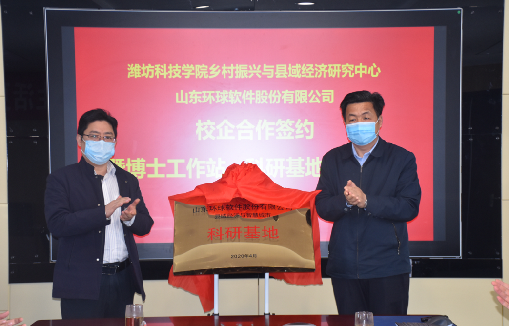 4月23日,濰坊科(ke)技學(xue)院(yuan)鄉村振興與(yu)縣域經(jing)(jing)濟研究中心與(yu)山東(dong)環(huan)球軟(ruan)件(jian)股份(fen)有限公(gong)司校企合作簽約暨“縣域經(jing)(jing)濟與(yu)智慧(hui)城市”博(bo)士工作站、科(ke)研基地揭牌儀式在(zai)環(huan)球軟(ruan)件(jian)公(gong)司成功舉行(xing)。濰坊科(ke)技學(xue)院(yuan)新時代鄉村振興與(yu)區域經(jing)(jing)濟發展(zhan)研究院(yuan)執行(xing)院(yuan)長(chang)張友祥與(yu)環(huan)球軟(ruan)件(jian)董(dong)事(shi)長(chang)劉德(de)永共同簽署了(le)協議書,并進行(xing)了(le)座談交流。壽光市政府機關黨(dang)組(zu)成員、大數據中心主任趙春生,濰坊科(ke)技學(xue)院(yuan)副校長(chang)李(li)廣偉及相關人員出席儀式。