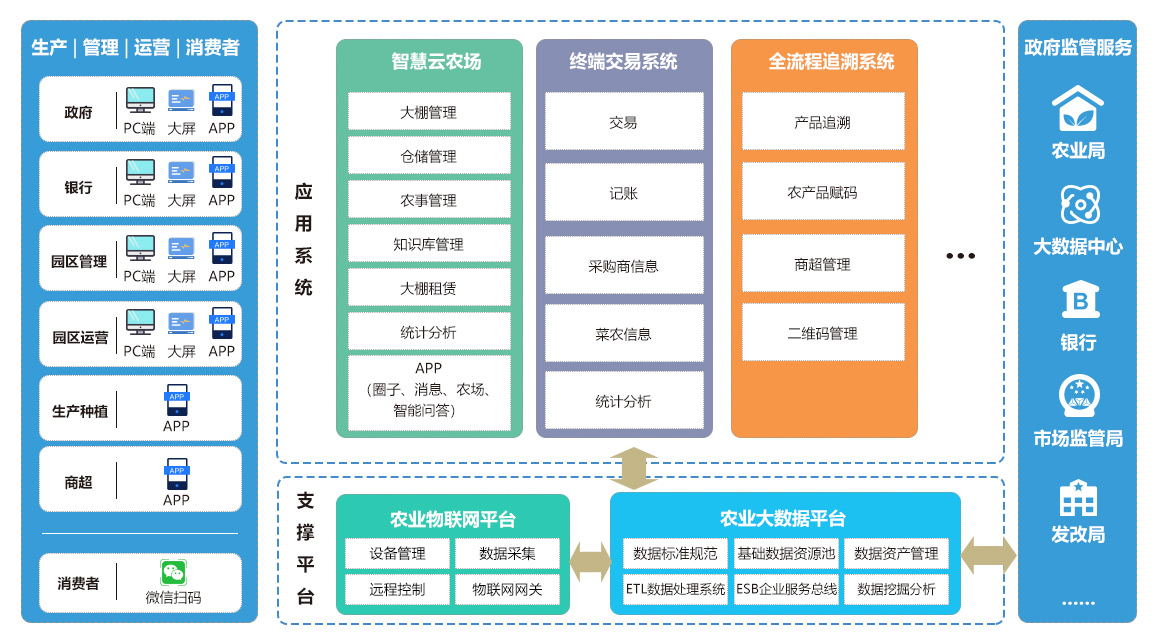 壽光(guang)(guang)蔬(shu)菜智慧管理(li)服務(wu)平(ping)(ping)臺”采用“1+2+N”的總體框架,“大(da)數據(ju)平(ping)(ping)臺”作(zuo)為基礎支撐(cheng)平(ping)(ping)臺,可提(ti)供(gong)(gong)涉農(nong)數據(ju)的錄(lu)入和提(ti)報功能,并搭建了(le)涵蓋人口、涉農(nong)企(qi)業、大(da)棚、農(nong)資(zi)等(deng)28個維度(du)、1000多萬條數據(ju)的基礎數據(ju)資(zi)源(yuan)池。同時(shi),通過整合其他模塊靜(jing)態(tai)錄(lu)入數據(ju),動態(tai)采集數據(ju),對平(ping)(ping)臺獲取的各類數據(ju)進(jin)行(xing)整合與挖掘(jue);對蔬(shu)菜產(chan)業鏈經(jing)(jing)(jing)營主體(農(nong)民、涉農(nong)經(jing)(jing)(jing)營單(dan)位等(deng))高精(jing)度(du)畫像,為農(nong)民、涉農(nong)經(jing)(jing)(jing)營單(dan)位量身(shen)定做金融(rong)產(chan)品,提(ti)供(gong)(gong)開戶、授信、開卡、電子銀行(xing)產(chan)品簽約、理(li)財、支付(fu)結算等(deng)金融(rong)服務(wu)。該平(ping)(ping)臺的高效實施,將搭建壽光(guang)(guang)智慧蔬(shu)菜樣板間(jian),助力政府實現管理(li)服務(wu)精(jing)細化(hua)。