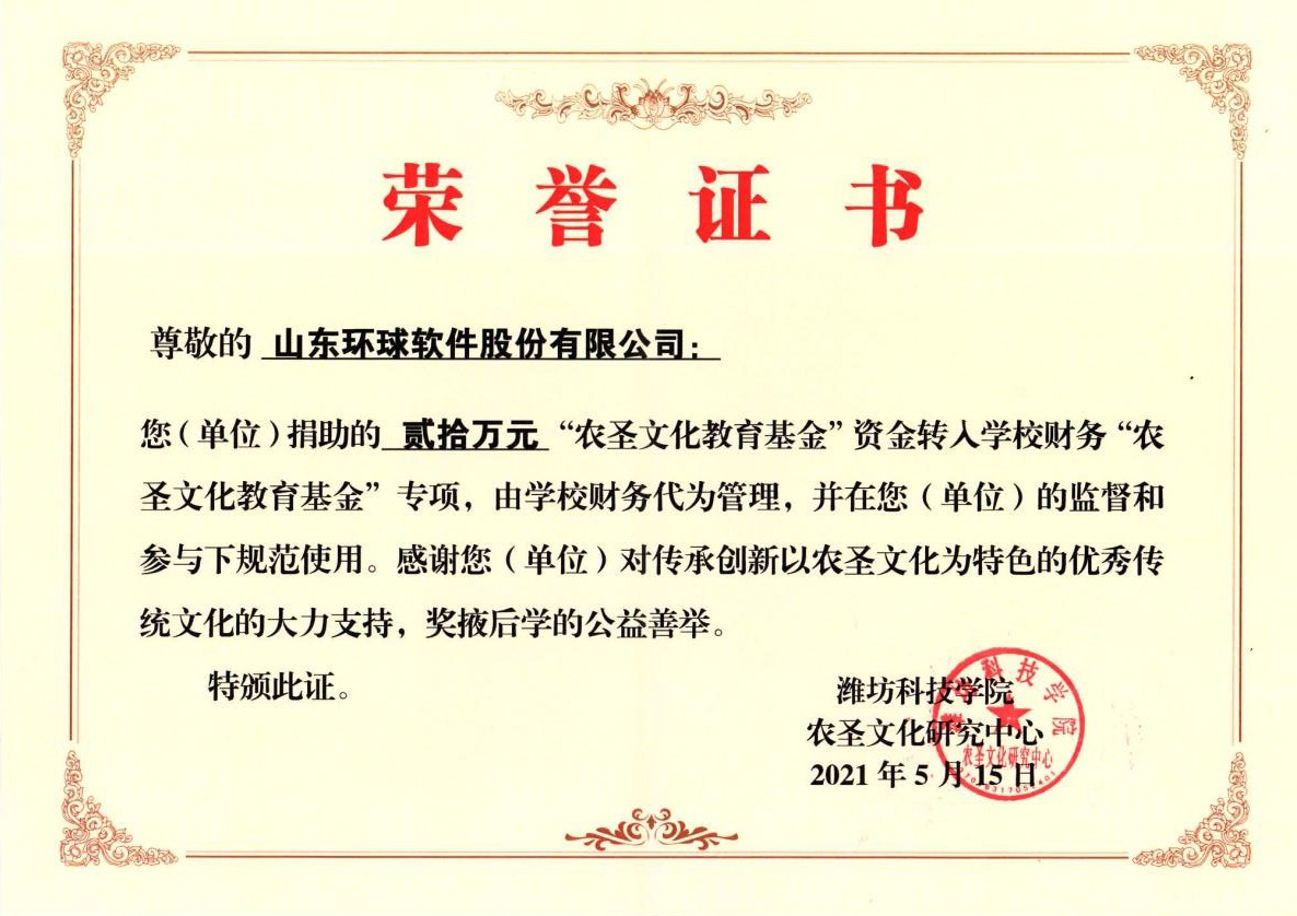 5月15日,第(di)十一屆(jie)中華農圣文化(hua)國際研討會(hui)(hui)暨中國農業歷史學(xue)(xue)(xue)會(hui)(hui)農學(xue)(xue)(xue)思想與《齊民要(yao)術》專(zhuan)業委(wei)員會(hui)(hui)學(xue)(xue)(xue)術年會(hui)(hui)(2021)在濰坊科(ke)技學(xue)(xue)(xue)院召開(kai)。會(hui)(hui)上(shang),濰坊科(ke)技學(xue)(xue)(xue)院“農圣文化(hua)教(jiao)育基金”成立儀式舉行。環球軟件(jian)為“農圣文化(hua)教(jiao)育基金”捐贈20萬元,用實際行動助力“產學(xue)(xue)(xue)研”融合發展。