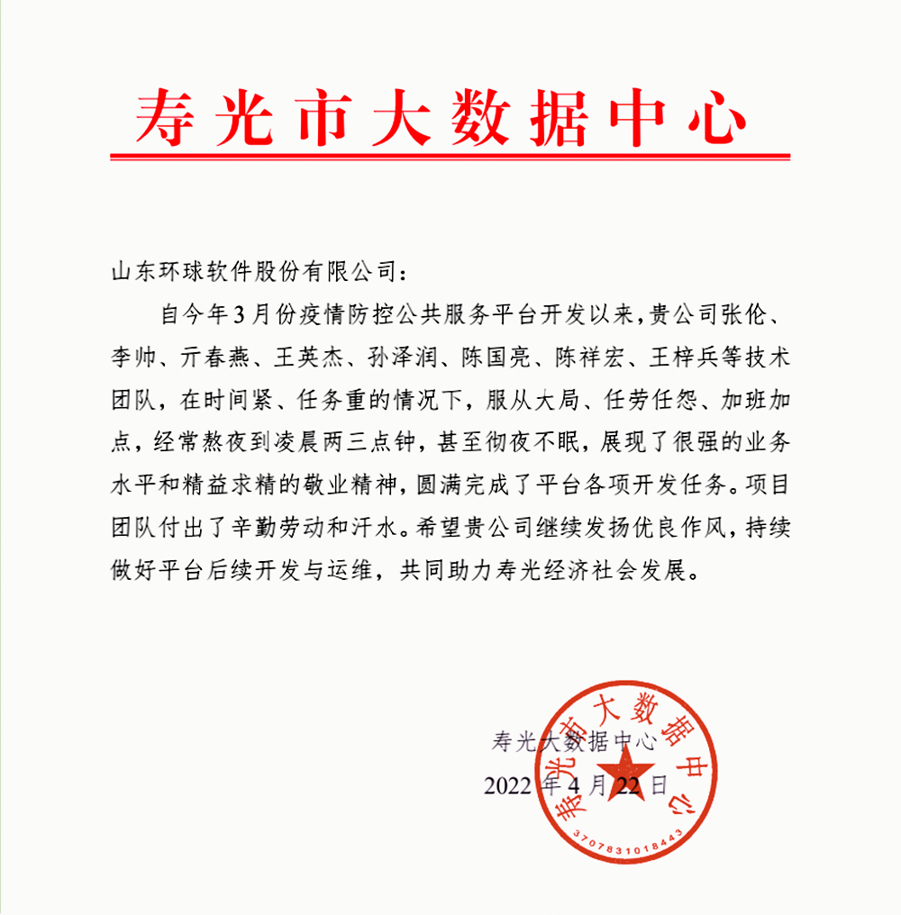 4月22日(ri),壽光市大數據中心給環(huan)球(qiu)(qiu)軟件(jian)發來感(gan)謝(xie)信,對(dui)環(huan)球(qiu)(qiu)軟件(jian)在(zai)疫(yi)情防控(kong)公(gong)共服務平臺(tai)項目(mu)上的高度重視(shi)以及對(dui)項目(mu)組(zu)成員的優秀(xiu)工作(zuo)表(biao)現(xian)予以表(biao)揚!