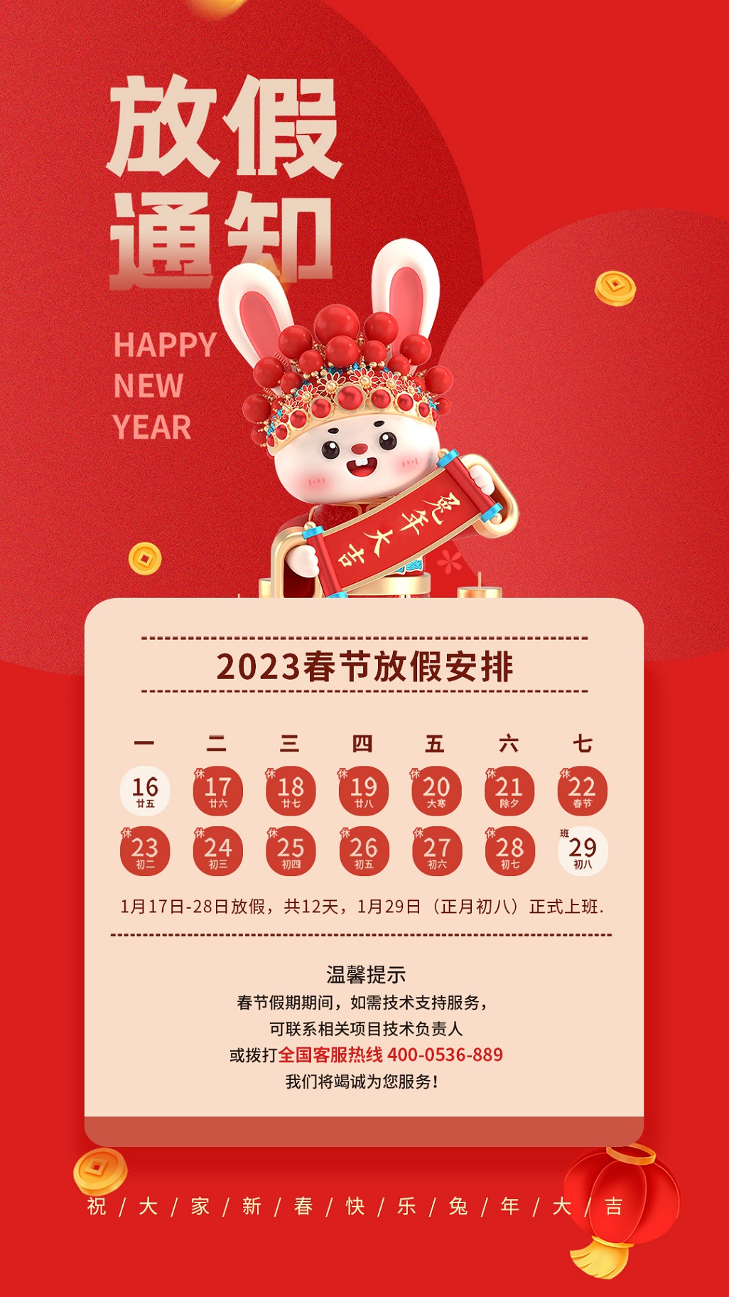 根據國務院(yuan)辦公廳(ting)關于2023年節(jie)假(jia)日安排,經公司經營管理(li)委(wei)員會研究決定,環球(qiu)軟件(jian)2023年春(chun)節(jie)放假(jia)安排:2023年1月(yue)(yue)(yue)17日(臘月(yue)(yue)(yue)二十六)至1月(yue)(yue)(yue)28日(正(zheng)月(yue)(yue)(yue)初七)放假(jia),共12天,1月(yue)(yue)(yue)29日(正(zheng)月(yue)(yue)(yue)初八)正(zheng)式上班!