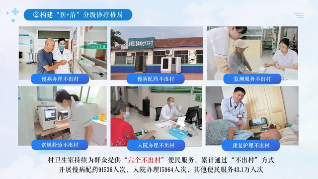 其次,構建“醫+治”分級(ji)(ji)診(zhen)療(liao)格局。充分發揮(hui)衛(wei)生院(yuan)作為(wei)(wei)單病種群(qun)體管(guan)理(li)工作的(de)延伸(shen)作用,由全科(ke)醫師負責(ze)首診(zhen)患者(zhe)和協調會診(zhen),縣(xian)級(ji)(ji)醫院(yuan)負責(ze)質控指(zhi)導和雙向轉診(zhen),持續為(wei)(wei)基層群(qun)眾提供慢病管(guan)理(li)、監測服務、常規檢(jian)驗、康復護理(li)等“六個不出(chu)村”服務。目前,通過“不出(chu)村”方式為(wei)(wei)群(qun)眾開展(zhan)各類健(jian)康服務54.1萬人次,并將(jiang)28.6萬人納入單病種群(qun)體管(guan)理(li),實現了(le)專業醫療(liao)資源和鎮村醫療(liao)機(ji)構的(de)無縫銜接。