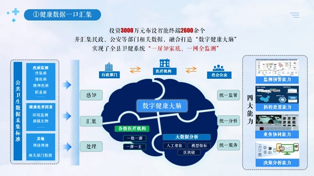 首先,健康數(shu)(shu)據一(yi)口匯聚(ju)。投(tou)資3000多(duo)萬元在各級醫療機構布設智能終端2600多(duo)個,整(zheng)合衛健、民(min)政、公安等部門構建了(le)縣域(yu)健康大數(shu)(shu)據平臺,450萬份病(bing)歷數(shu)(shu)據、230萬張影像數(shu)(shu)據和7600多(duo)名醫衛人(ren)員(yuan)能力數(shu)(shu)據,自(zi)動(dong)上傳匯總、科學分析共享,日交互數(shu)(shu)據量(liang)達8.2萬次以上,實現(xian)了(le)全(quan)縣衛健系(xi)統“一(yi)屏知家底、一(yi)網全(quan)監測、一(yi)鍵達基層”。