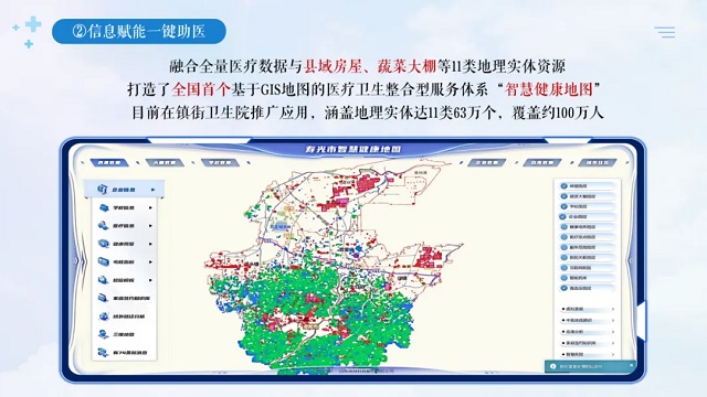 其次,信息賦能(neng)一鍵(jian)助(zhu)(zhu)醫。依托“數字(zi)健康大腦(nao)”,開(kai)發建設了互(hu)(hu)聯網醫院、智慧(hui)(hui)藥房、分娩人臉識別等25項子(zi)系(xi)統,實現了相關檢(jian)查(cha)信息互(hu)(hu)通、檢(jian)查(cha)結(jie)果互(hu)(hu)認、遠(yuan)程會(hui)診(zhen)協作。借助(zhu)(zhu)DeepSeek模(mo)型(xing)動(dong)態(tai)整(zheng)合居民健康數據,陸續推出AI動(dong)態(tai)心(xin)電、AI互(hu)(hu)聯網問診(zhen)、AI輔(fu)助(zhu)(zhu)診(zhen)斷(duan)等模(mo)塊,成(cheng)功上線智能(neng)醫護助(zhu)(zhu)手。系(xi)統整(zheng)合全量(liang)醫療(liao)數據與縣域(yu)房屋、蔬(shu)菜大棚等11類(lei)地理實體資源(yuan),打造了全國(guo)首個基于GIS地圖的醫療(liao)衛(wei)生整(zheng)合型(xing)服務(wu)體系(xi)“智慧(hui)(hui)健康地圖”,相關做(zuo)法(fa)被國(guo)家衛(wei)健委、省衛(wei)健委發文推廣。