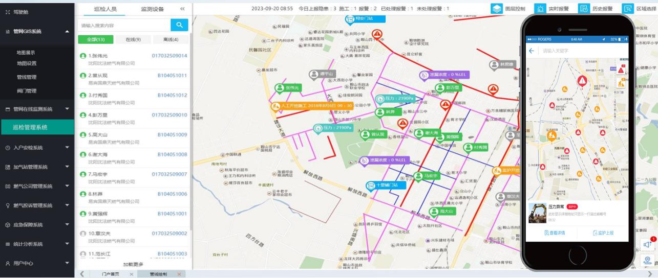 一張圖顯示(shi)管網、監測設備、巡檢人員、存在(zai)隱患情況、 施工情況等信(xin)息,隨時抽查(cha)巡檢數據,提高巡檢質量。