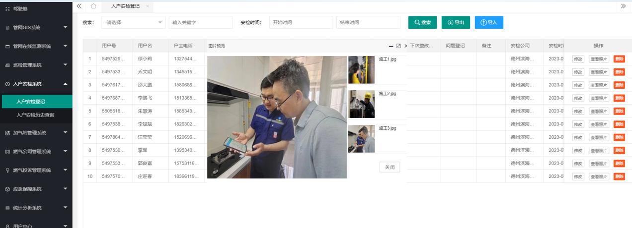 聯(lian)動管(guan)理,實現(xian)燃(ran)氣公司庫(ku)(ku)(ku)、從業人員庫(ku)(ku)(ku)、GIS庫(ku)(ku)(ku)、燃(ran)氣安檢用(yong)戶庫(ku)(ku)(ku)、應急處置庫(ku)(ku)(ku)等數字(zi)化管(guan)理,實現(xian)政府監(jian)管(guan)部門(men)對燃(ran)氣企業信息(xi)的(de)全盤(pan)掌(zhang)握。