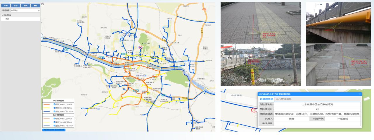 按管(guan)線年限,泄漏(lou)次數(shu),防(fang)腐破(po)損次數(shu),埋深不足次數(shu),封閉占(zhan)壓次數(shu),管(guan)網周邊環境等因(yin)素進(jin)行綜合評估,確定管(guan)段(duan)的風險等級(ji),自動以(yi)不同顏色進(jin)行標記(ji),形(xing)成管(guan)網風險情況(kuang)分布圖。